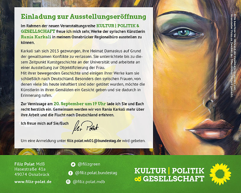 Filiz Polat, Bundestagsabgeordnete von Bündnis 90/Die Grünen, feiert den Auftakt zu ihrer neuen Veranstaltungsreihe KULTUR | POLITIK & GESELLSCHAFT. Ab Donnerstag den 20. September werden Werke der syrischen Künstlerin Rania Karkali im Osnabrücker Regionalbüro in der Hasestr. 41a ausgestellt.